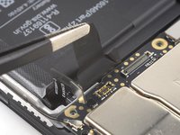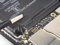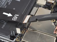 Use a pair of blunt nose tweezers or a clean fingernail to peel off both battery adhesive pull-tabs to unstick them from the top edge of the battery.