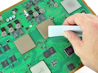 Using the flat end of the spudger, remove the old thermal paste off the CPU and GPU on the motherboard.