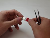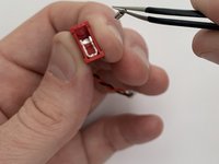 Pinch the spring with the angled tweezers, bringing it to a vertical position. Then push down on the spring to remove it from the port that it is connected to.