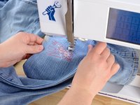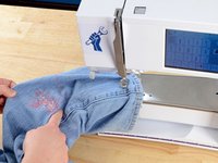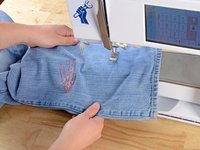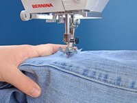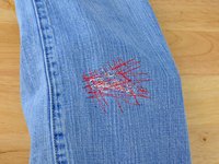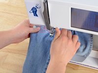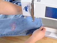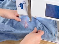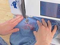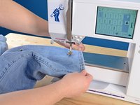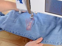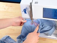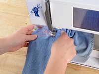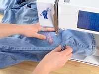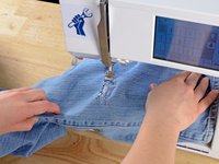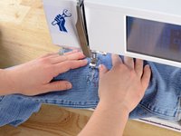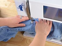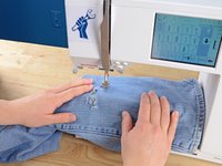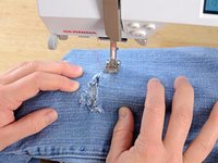 Just like before, at the end of each line of stitching, lift the pressor foot, rotate the jeans a few degrees, and sew another line of stitching.