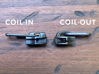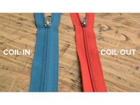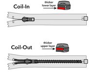 On a coil zipper, the coil can lay on the inside or the outside of the zipper tape. This further categorizes this zipper type into coil-in and coil-out.