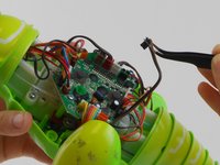Disconnect the wire that connects the back cover of the dino to the main circuit board by carefully pulling on the orange wire connector with tweezers.