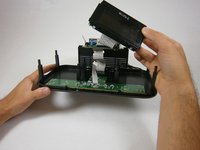 Lift up the bottom cover. Pull the side panel up first, out, and away from the device.