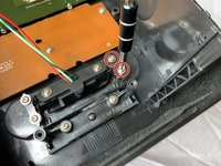 Locate the green circuit board. This panel is clipped onto two black, circular-shaped columns at two corners.