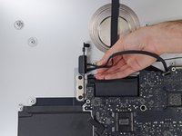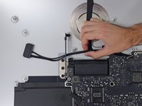 Pull the hard drive SATA cable and connector through the right hard drive bracket. Move the cable to the right side of the iMac, out of the way of the exhaust port.