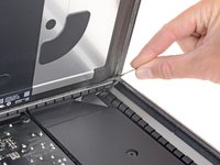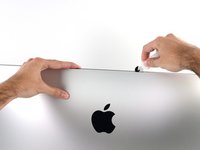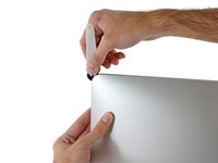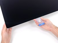 Grasp the small tab at the end of one of the bottom edge display adhesive strips and pull the adhesive toward the top of the iMac to remove it.