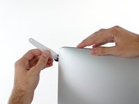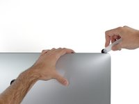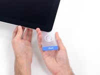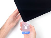 Starting from the top right corner of the iMac, insert a plastic card between the display and frame.