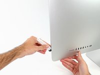 Starting on the left of the display, near the power button, insert the iMac Opening Tool into the gap between the glass panel and the rear case.