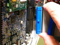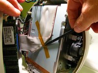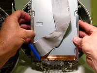 You should now be able to swing the Bottom Housing out enough to disconnect the Hard Drive Data Cable. Again, only pull on the blue plastic connector, not the ribbon cable.