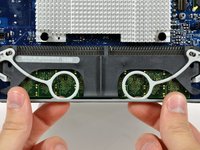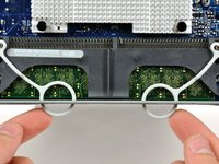 Push the two RAM arms protruding from the access door inward and set them on the lower edge of the rear case to prevent them from getting caught when removing the logic board.