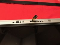Gently guide the microphone connector and cables through the ±1in long slot at the right of the iSight camera. Once the bezel is properly assembled, gently push the microphone connector and cable into the bezel through that slot.