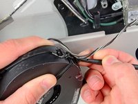 Being careful not to put too much strain on the left speaker cable, flip the CPU fan over to expose its bottom edge.