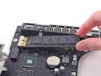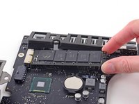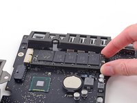 Slightly lift the rightmost side of the SSD and firmly slide it straight away out of its socket on the logic board.