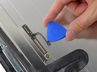 Step 24: Use the tip of a spudger to flip up the metal retaining bracket on the display data cable.