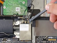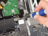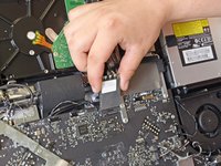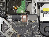 Locate the AirPort card at the top center of the logic board and just below the hard drive.