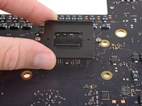Lift and remove the backing plate from behind the CPU heat sink. The backing plate has two posts that fit into alignment holes in the logic board.