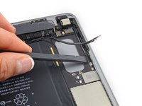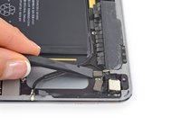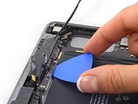 Firmly grasp the antenna cable and peel up the grounding tape attaching it to the logic board.