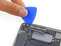 Slowly break the adhesive by carefully moving the pick underneath the volume button cable.