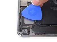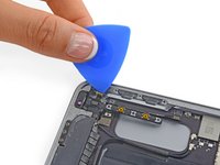 Slide a battery isolation pick underneath the battery connector area of the logic board, and leave it in place while you work.