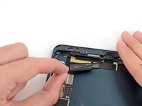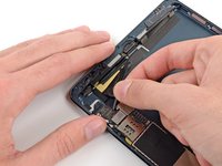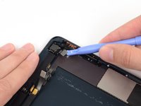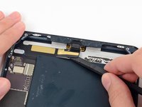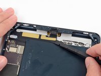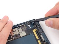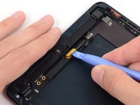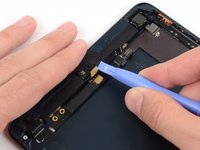 Slide the flat end of a spudger underneath the Lightning port cable, freeing it from the adhesive securing it to the rear case.