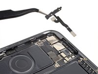 Use the point of your spudger to pry up and disconnect the volume press connector from the right arm of the logic board.