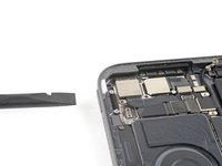 Slide your opening pick 9 cm toward the center of the top edge to slice the adhesive, paying attention to the spots mentioned in the previous step.