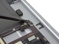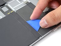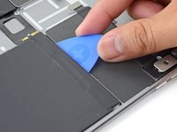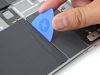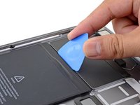 Insert the flat edge of an opening pick into the crevice above the top right edge of the battery.