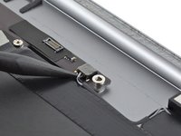 Slide the point of a spudger under the right speaker connector wires near the top right corner of the logic board.
