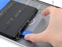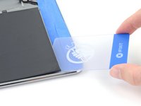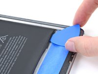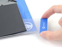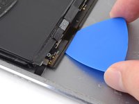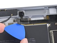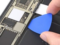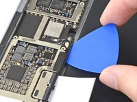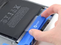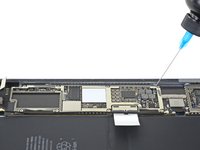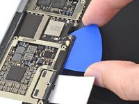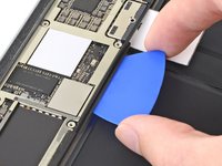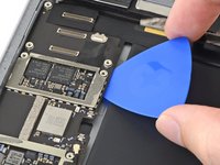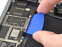 Slide the opening pick about 0.5 inches (13 mm) under the logic board's left side next to the battery connector.