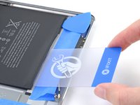 Slide the long edge of a plastic card about 0.5 inches (13 mm) under the center of the mid-battery circuit board to cut through the remaining adhesive.
