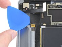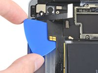 Use an opening pick to cut through the adhesive under the left ribbon cable next to the lower speaker and detach it from the frame.