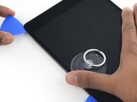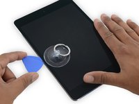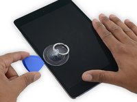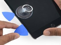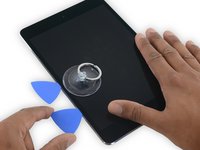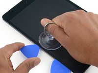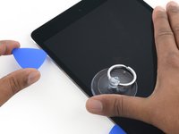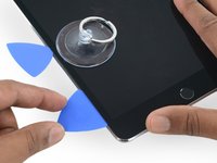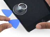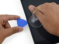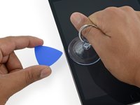 While holding the glass up with the suction cup, insert the point of an opening pick into the gap between the glass and body of the iPad.