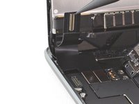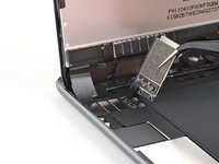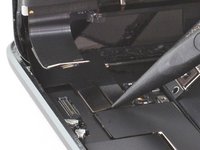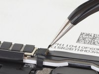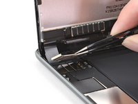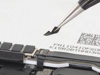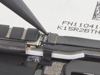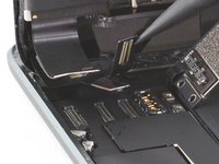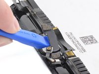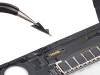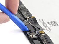 Insert the flat end of a spudger under the display cable bracket and lift up to disconnect the battery press connector from the logic board.