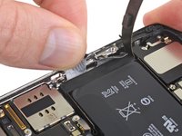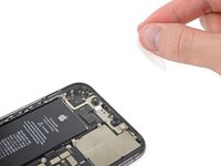 Using the same procedure as before, pull both tabs at the same time to stretch and remove the remaining adhesive strip holding the battery in place. Try not to snag the adhesive on the edge of the iPhone.