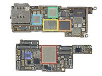 • The layered logic board is even teensier this year, and unfortunately the SIM card reader is now baked onto the board (booo!). In any case, let's see what chips are lying on the surface: