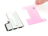 Align the battery shim so it's flush with the new loudspeaker's left edge and underside. Press it onto the loudspeaker to adhere it.