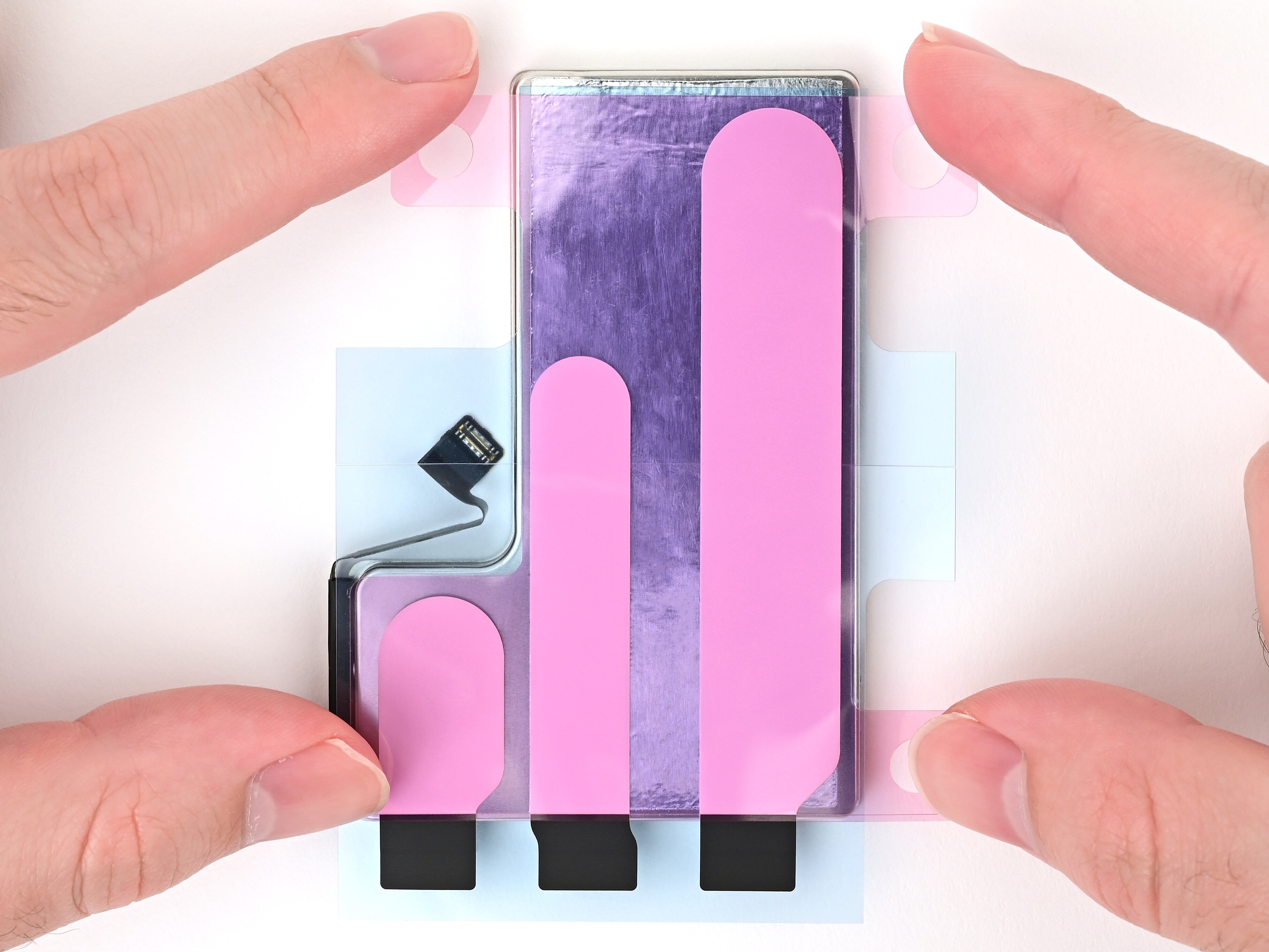 Lay the adhesive onto the battery and press each strip firmly into place.