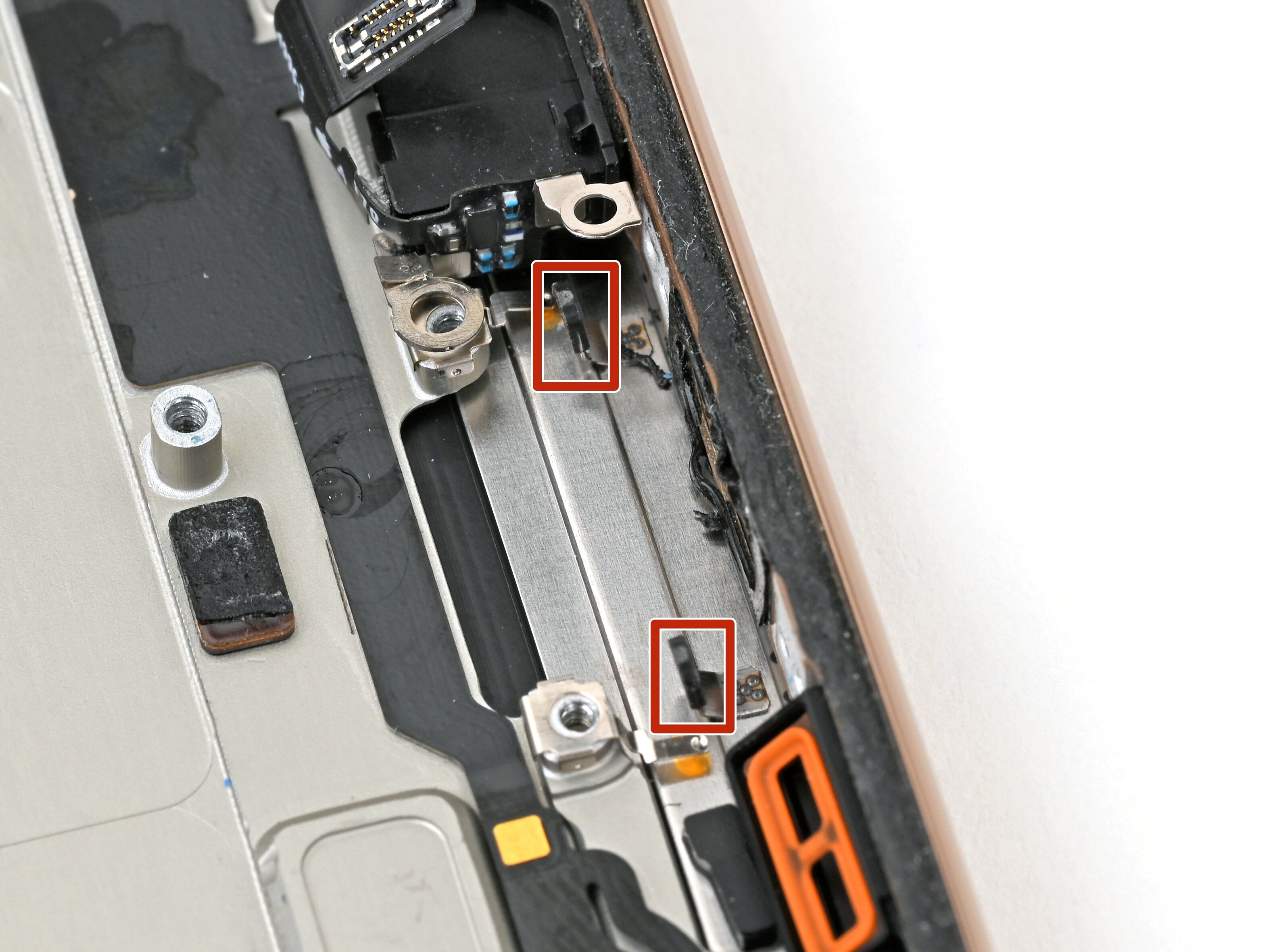 Grounding clips clip on top of both screw posts under the charging port. Make sure they're still clipped in place. The clips should face towards the bottom edge of the iPhone.