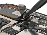 Use the point of a spudger to pry up and disconnect the earpiece speaker and 5G mmWave antenna press connectors, located on the top right corner of the logic board.