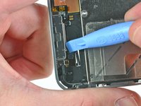 Use the edge of a plastic opening tool to pry the vibrator off the adhesive securing it to the frame of the iPhone.