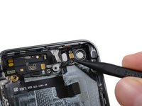 Using a pair of tweezers, flip the rubber camera cover out of its clip and toward the outside of the rear case.