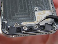 Remove the following screws securing the volume button and ringer switch brackets to the side of the rear case: