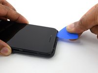 Slide an opening pick along the top edge of the iPhone, between the rear case and front panel, to break up the remaining adhesive holding the screen in place.