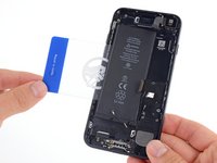 After about a minute, remove the iOpener, flip the phone over and use a plastic card to break up any remaining adhesive behind the battery.