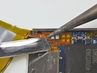 Start working from one side of the battery ribbon cable. In our case, we started on the left. Heat the leftmost solder pad while gently prying up from under the ribbon cable to free it from the board.