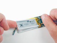 From the top of the iPod, insert a metal spudger between the outer case and the battery to remove the adhesive that holds the battery in place.