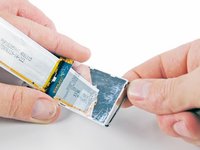 From the top of the iPod, insert a metal spudger between the outer case and the battery to remove the adhesive that holds the battery in place.
