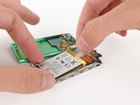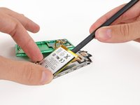 • Forgoing the tab in favor of some spudgering, we're able to pry the 3.7 V, 0.8 Wh, 220 mAh battery off the back of the display assembly.