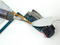 Start working from the outside of the battery ribbon cable. Heat the outermost solder pad while gently prying up from under the ribbon cable to free it from the board. Repeat this process for each of the two remaining pads, working from the outside in.