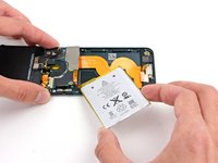 Once all of the adhesive is loosened, lift the battery up from the bottom and swing it out over the left side of the rear case.